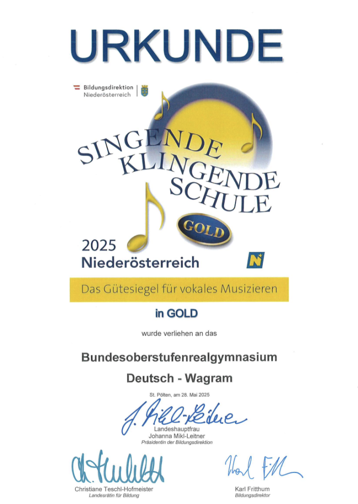 Das Zertifikat steht exemplarisch für die kontinuierliche Arbeit, die im schulischen Alltag geleistet wird, und ist ein Zeichen dafür, dass sich die Förderung musikalischer Talente und das gemeinsame Singen lohnen. Mit dem Gütesiegel in Gold zählt das BORG Deutsch-Wagram nun zu einer exklusiven Gruppe von Bildungseinrichtungen, die diese höchste Auszeichnung für musikalisches Engagement erhalten hat.